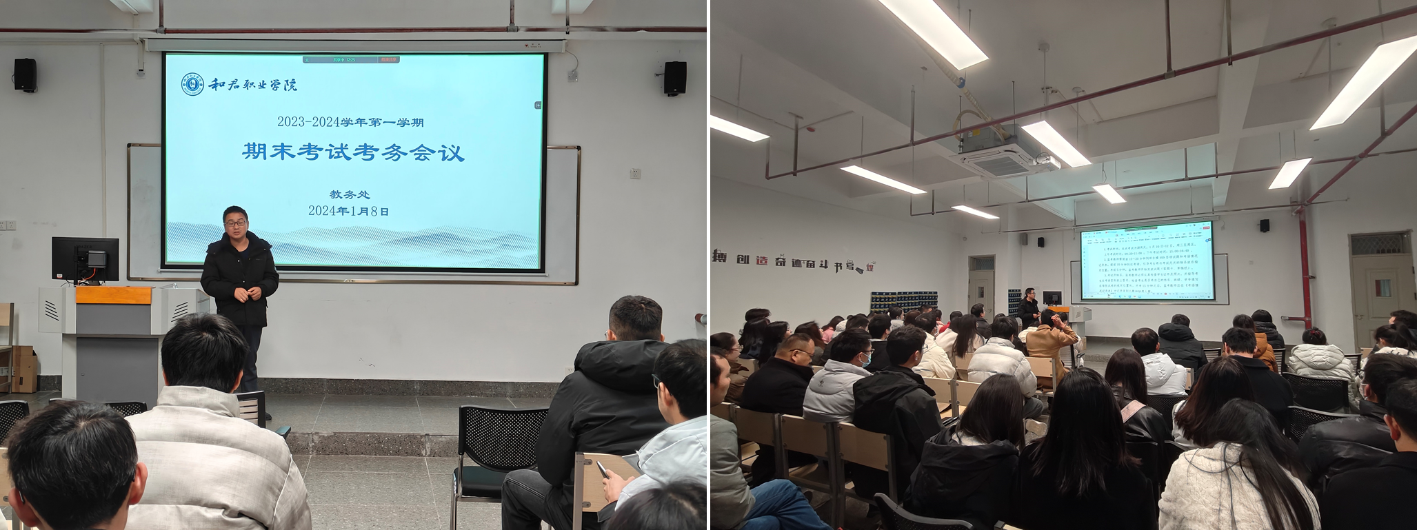 为了进一步加强对2023-2024学年第一学期期末考试的工作组织,扎实抓好各项开始工作𓀊,严肃考风考纪🧜‍♂️,营造公平、公正🦸‍♂️、和谐的考试环境🫸🏻。18日,教务处在西教学楼202召开期末考试考务会🕐,全体教师和行政人员参加会议。本次会议以 “线上+线下”形式举行,会议由教务处副处长郑勇军主持。强纪律 促学风——教务处召开期末考试考务会议