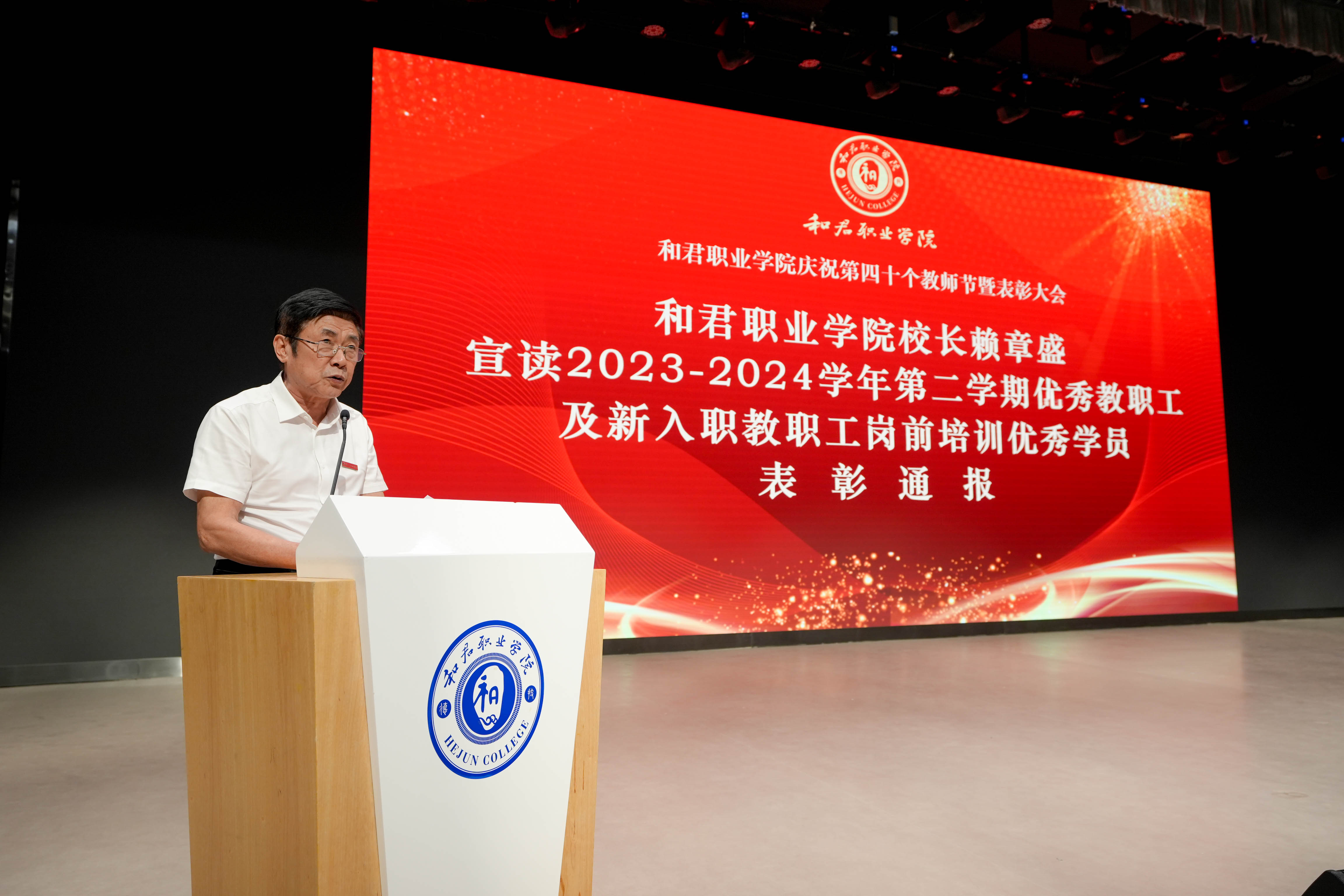 校长赖章盛宣读《2023-2024学年第二学期优秀教职工及新入职教职工岗前培训优秀学员表彰通报》⛑。他号召全体教职工要以受表彰的同志为榜样😹,强化使命担当,践行教育家精神,全面展示立德树人👩🏻✈️、自信自强的精神风貌🧗🏻♀️,以更加高昂的斗志、更加务实的作风🙍🏿♂️,解放思想、敢闯快干,为实现学校高质量发展而努力奋斗🎟。