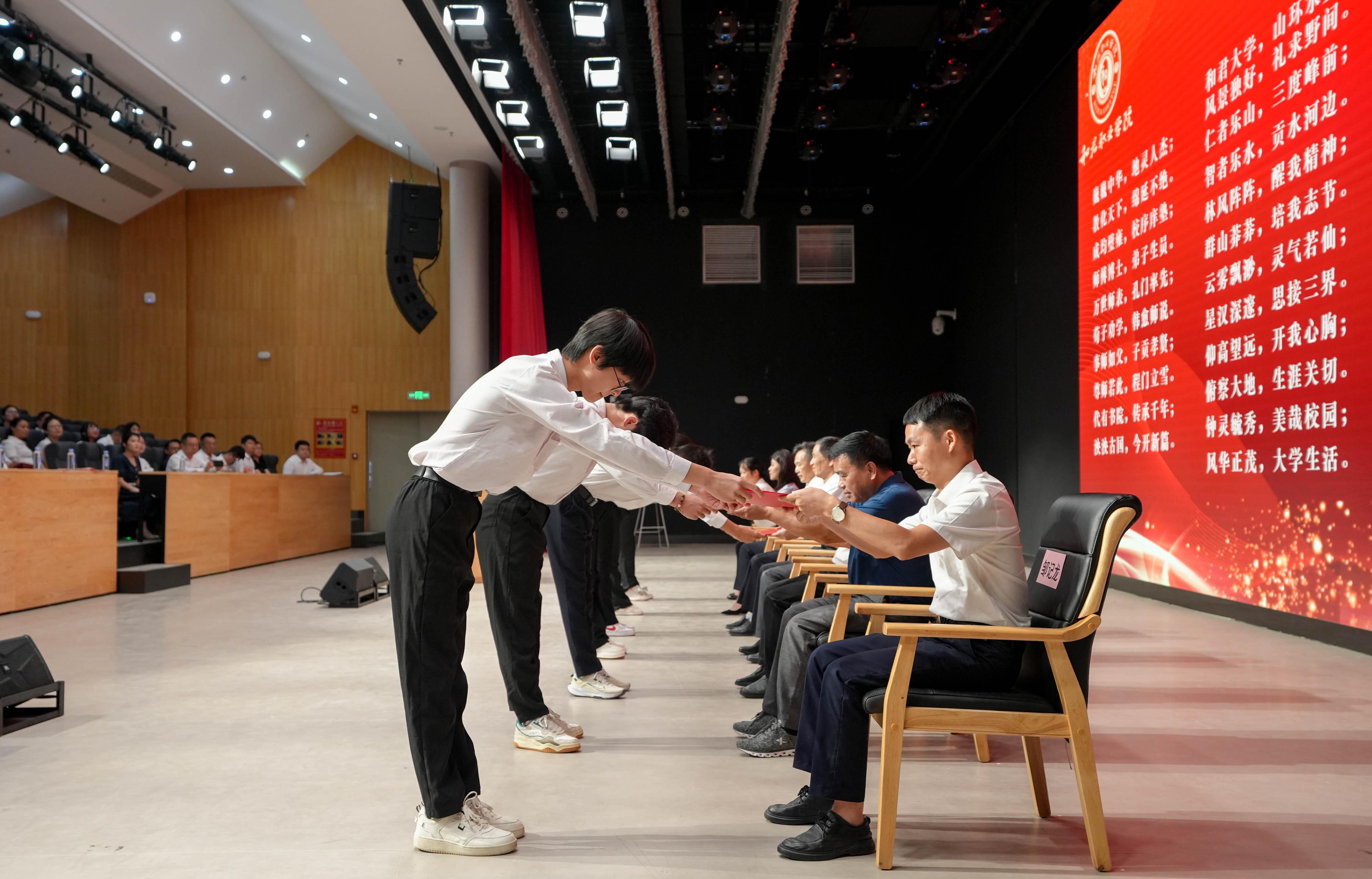大会弘扬学校优良的办学传统,精心策划寓意深刻的敬师仪式。在《高山流水》的悠扬旋律中,七位优秀学生代表向七位资深教师诵读《敬师赋》,献上“敬师礼”🧑🏽🎓,以此表达他们对老师的深深敬意和无限感激。