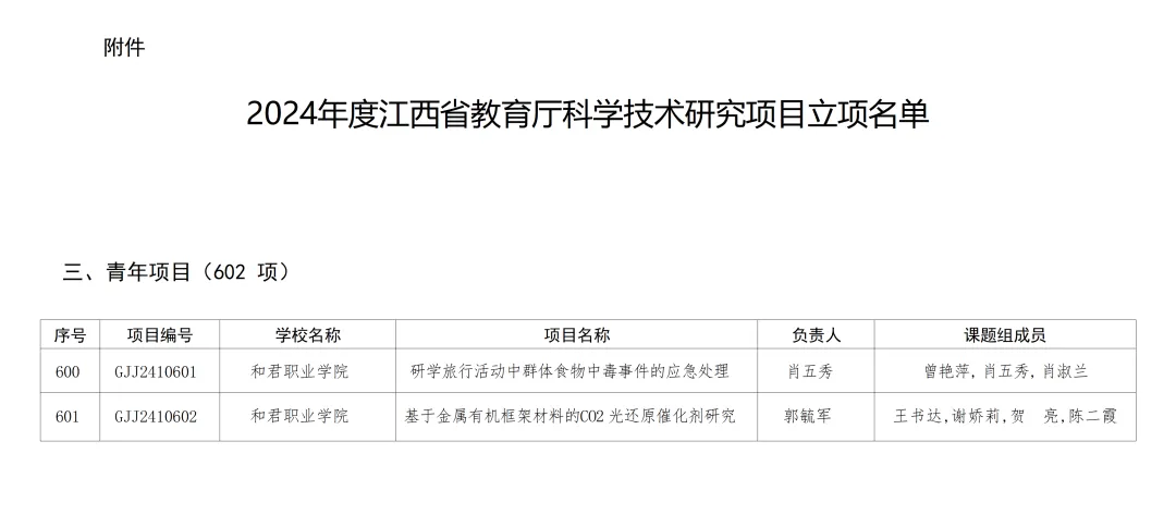 近日,2024年度江西省教育厅科学技术研究项目立项名单正式公布。经过严格的专家评审和省厅审核🙆🏻♀️,我校肖五秀申报的《研学旅行活动中群体食物中毒事件的应急处理》,郭毓军申报的《基于金属有机框架材料的CO2 光还原催化剂研究》两个项目脱颖而出🌅,成功获得立项批准。