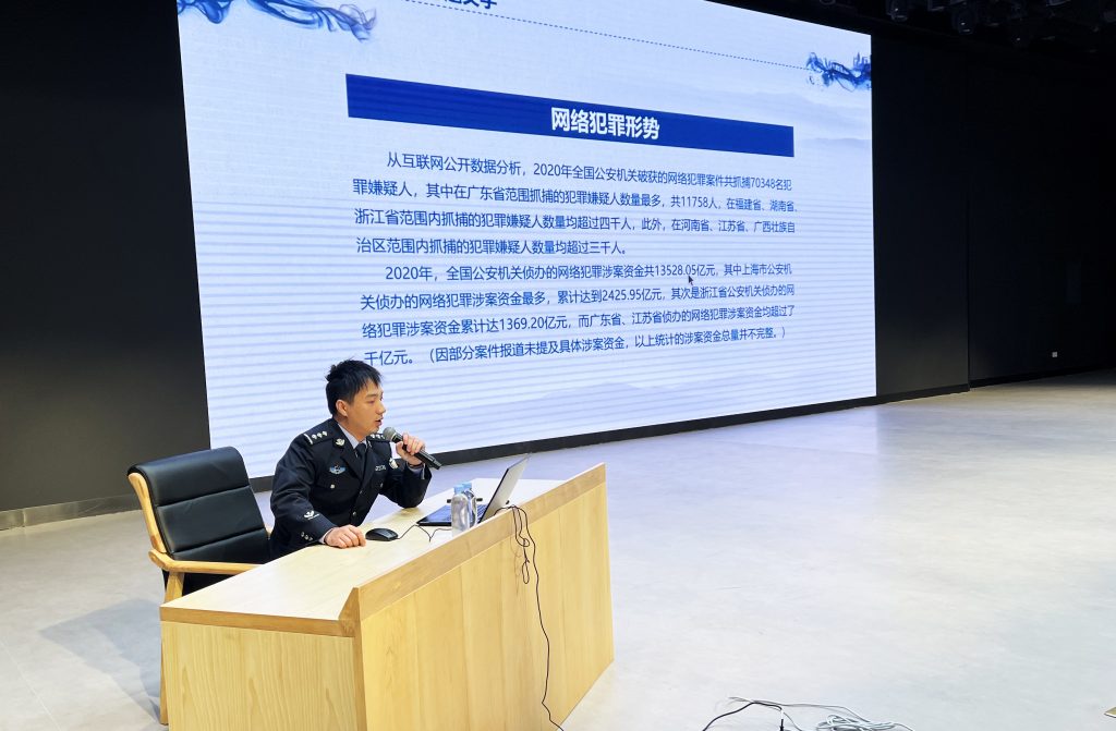 讲座上,董鑫警官通过讲述常见的五大网络传销类型案例让学生了解网络传销的手段和危害;他对近几年的网络诈骗案件进行数据分析,对网络犯罪的形势🧚🏽♀️、网络传销的发展变化进行了剖析;还详细介绍了网络黑产、网络赌博和网络色情等常见的诈骗手段,用直观且触目惊心的详实数据🫱🏿、案例事件给在场学生上了一堂生动的网络安全教育课🤥🤘🏼。最后🛌🏽,他不忘提醒在场的学生做好网络安全的三大方法,一是注意个人信息的防护,二是保护好你的密码,三是要远离网络谣言👩🍼🧑🦼➡️。