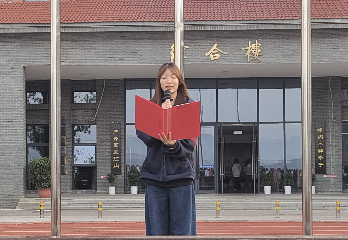休闲体育2401班肖雅轩同学作为学生代表发言。她回顾了学校师生前往于都县烈士纪念园开展清明祭扫活动的经历,分享了军训期间同学们以42公里“重走长征路”的徒步体验。她呼吁全体同学将红色基因转化为奋斗力量🦵🏼,在学习生活与成长成才中勇担使命,争做新时代有为青年。