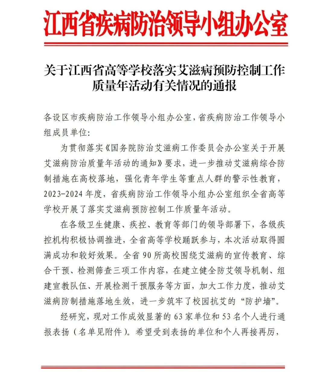 近期🙋🏽,江西省疾病防治工作领导小组通报表扬了在高等学校落实艾滋病预防控制工作中成效显著的63家单位和53名个人,我校荣获省级“红丝带先锋学校”荣誉称号。