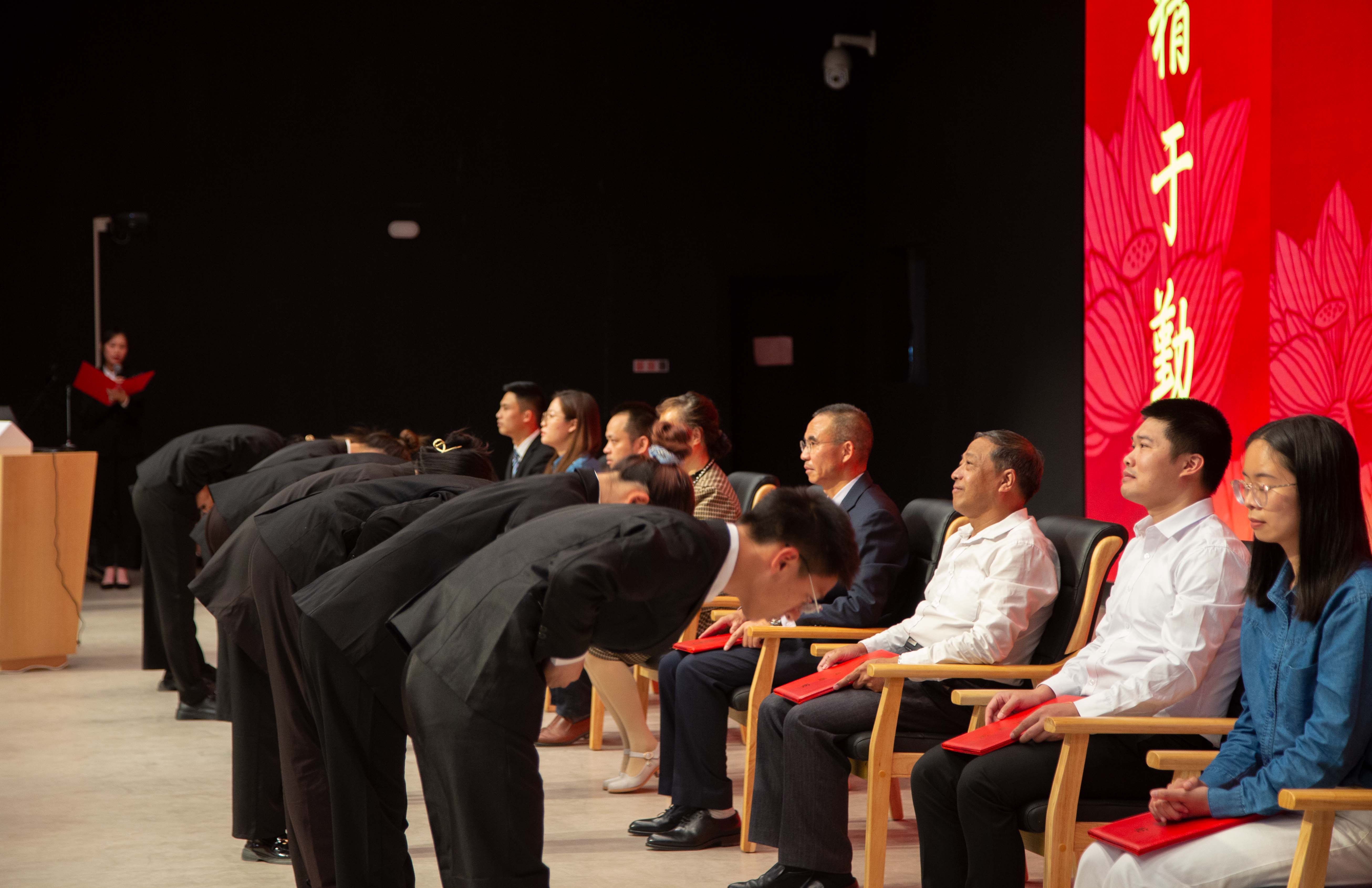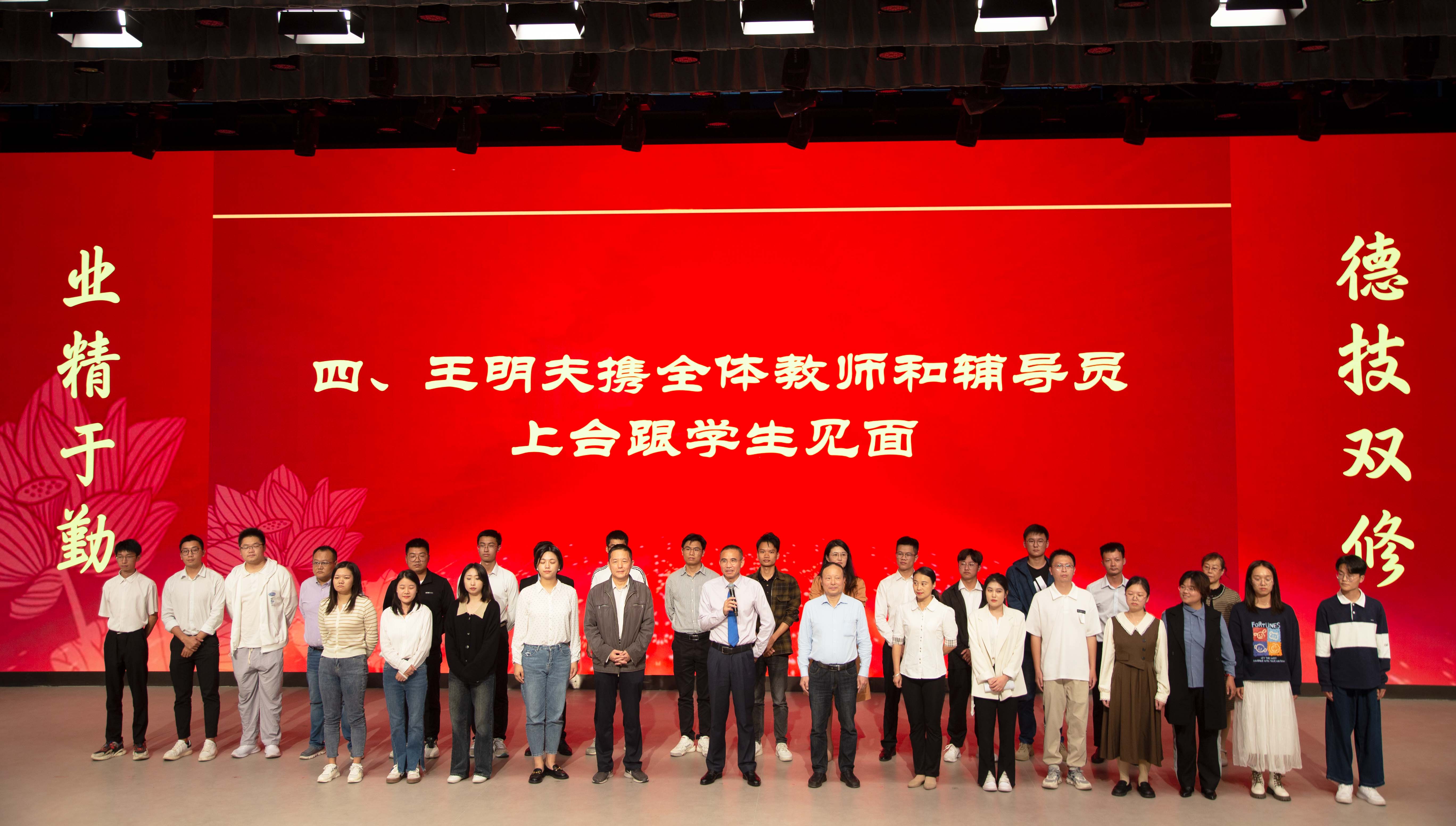 王明夫携教师代表🚣🏽♀️、辅导员代表上台与学生见面,并为学生送上祝福。
