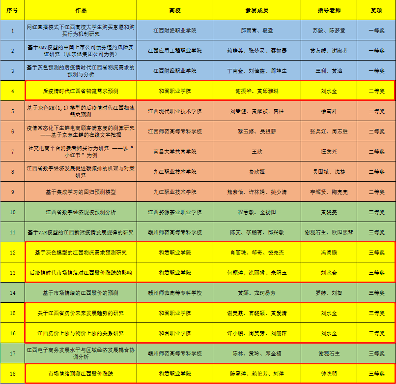 在这次决赛中,我校派出6支队伍参赛🤙,他们在比赛中奋发有为,努力争先🪷,充分展现了和君学子新时代青年的风采。其中谢振华😜、黄邱雅琳的作品《后疫情时代江西省物流需求预测》夺得二等奖,肖丽珠、邹奇📽、饶先杰的《基于灰色模型的江西物流需求预测研究》,何颖萍◾️、涂丽秀、朱阳玉的《后疫情时代市场情绪对江西股价涨跌的影响》🎬,谢美霞、官晓颖、黄爱清的《关于江西省房价未来发展趋势的研究》🤟🏽,许小鹏🌆、周美芳、刘丽萍的《江西房价上涨与物价上涨的关系研究》,陈惠萍🗿、赖艳芳、刘萍的《市场情绪预测江西股价涨跌》等5组作品荣获三等奖。