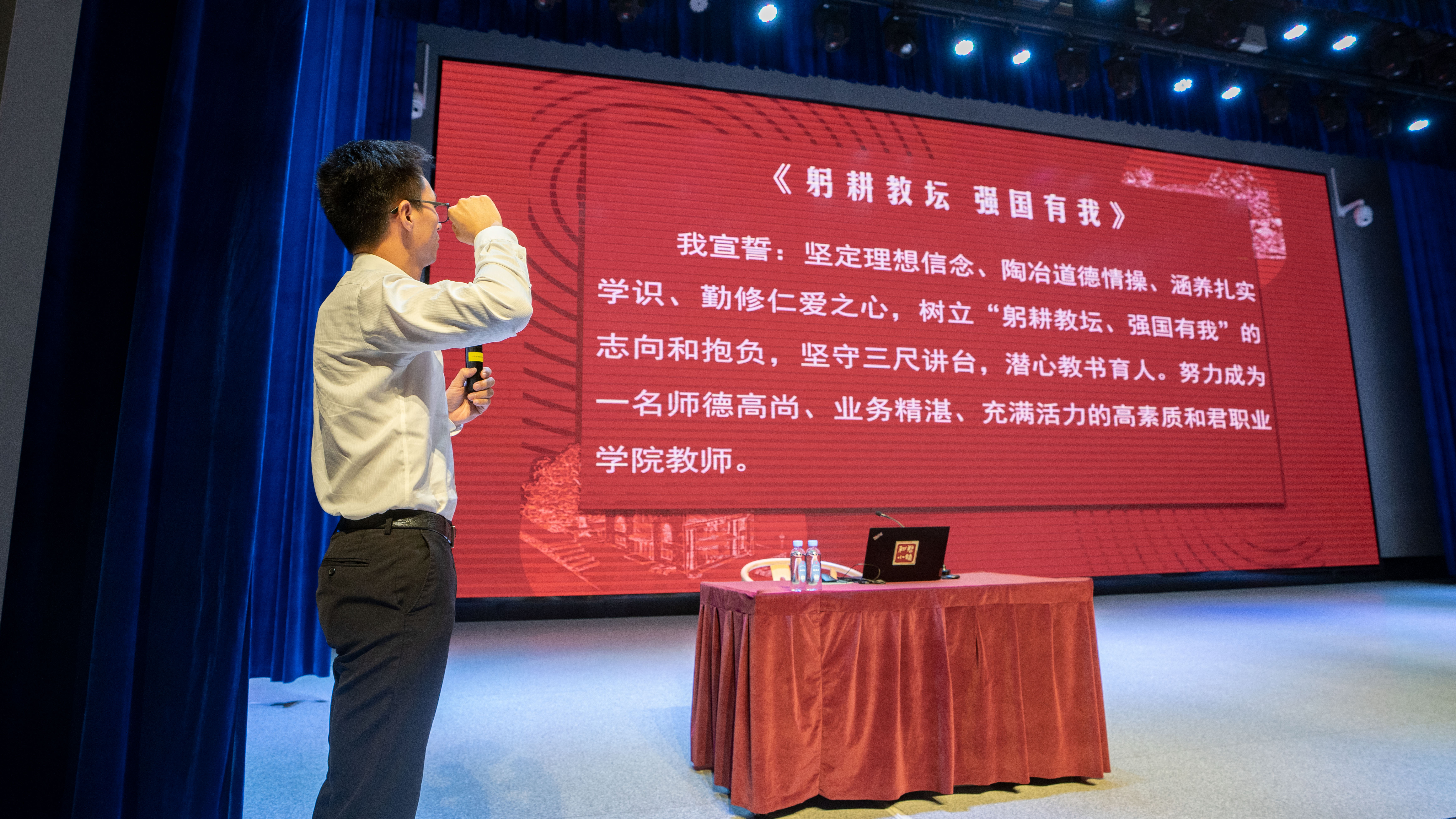 会议临近结束,在王明夫、李兴的带领下💇♀️,全体教职工起立,分别高声朗读《和职诵》🐢,并庄严举行了“躬耕教坛、强国有我”的集体宣誓。(撰稿/王继东💂🏼♂️🧑🎓,图片/李锐,初审/李锐,复审/王继东,终审/韩晓军🐨🐉。)