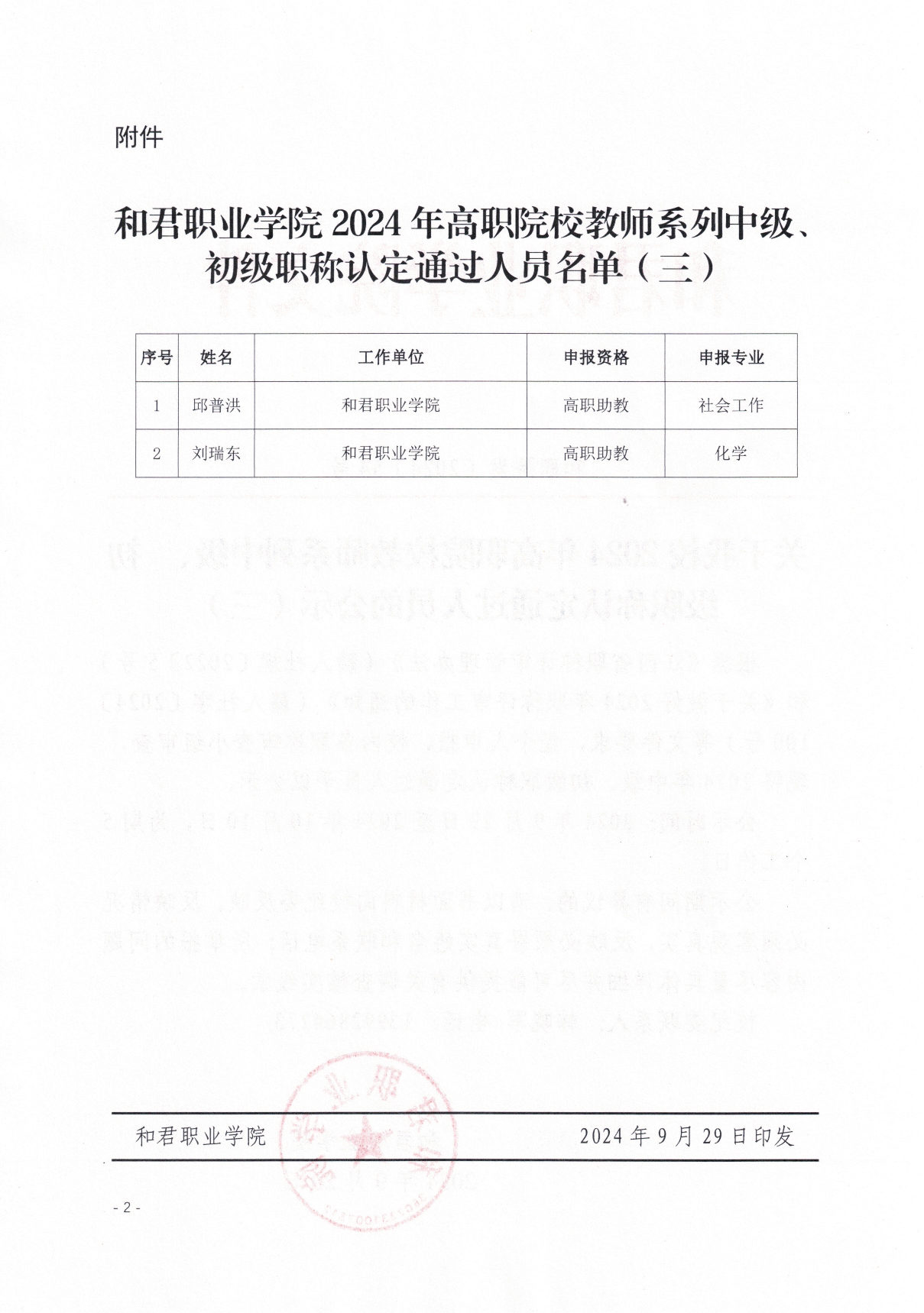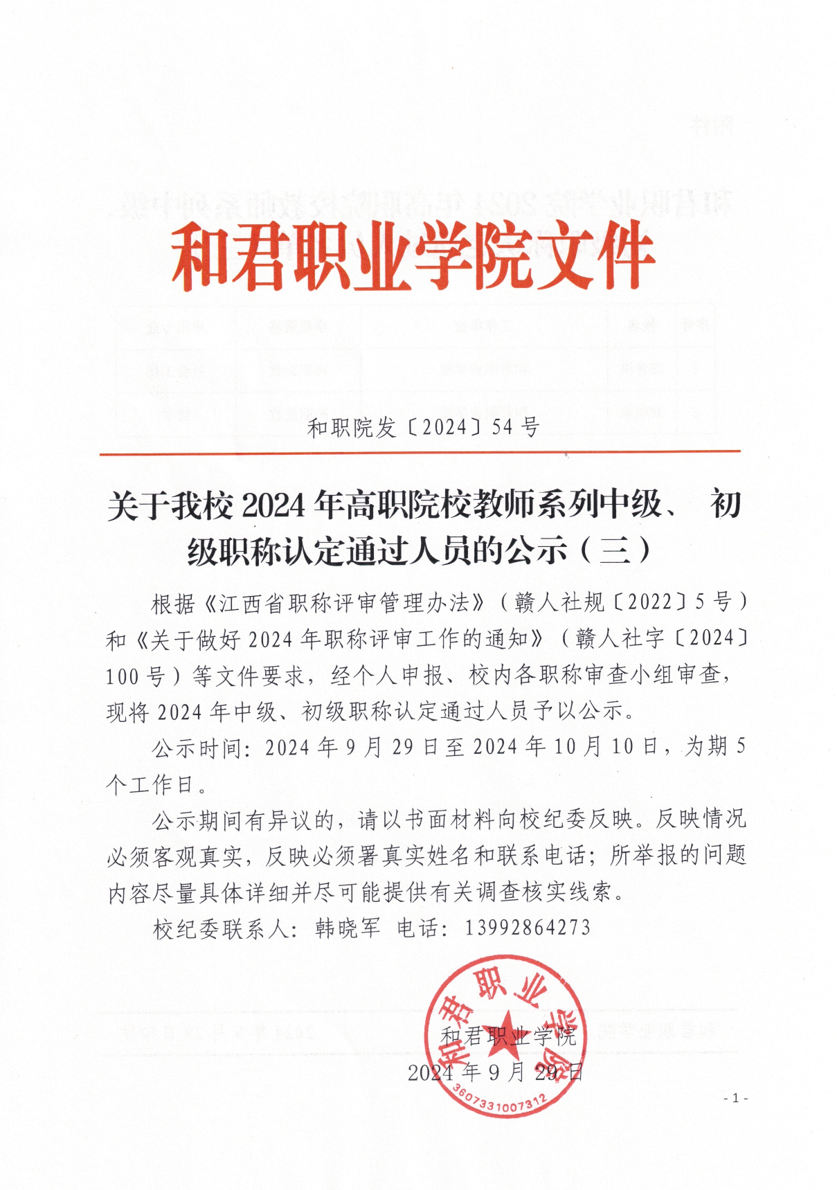 关于我校2024年高职院校教师系列中级🟩、初级职称认定通过人员的公示(三)