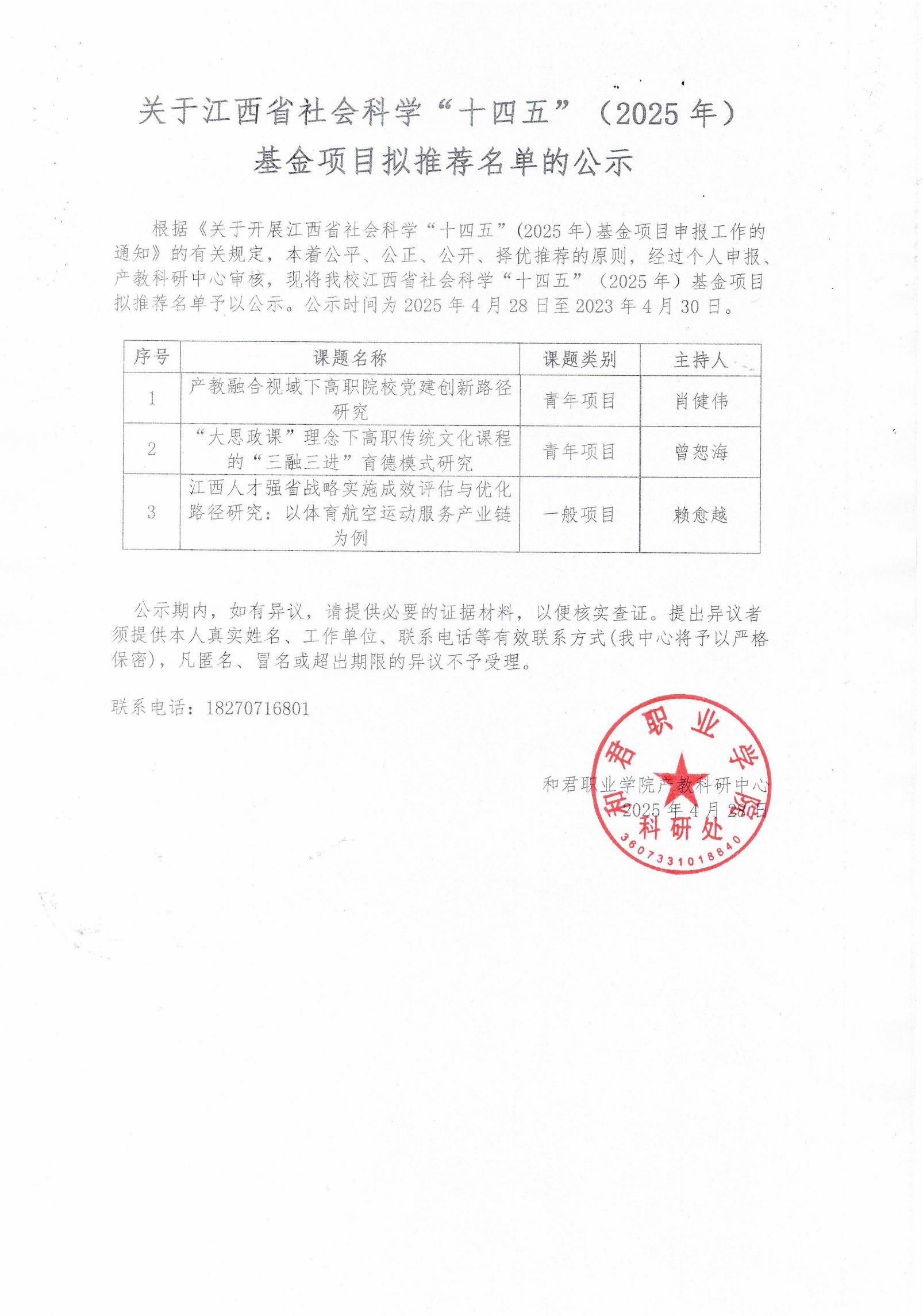 关于江西省社会科学“十四五”(2025 年)基金项目拟推荐名单的公示
