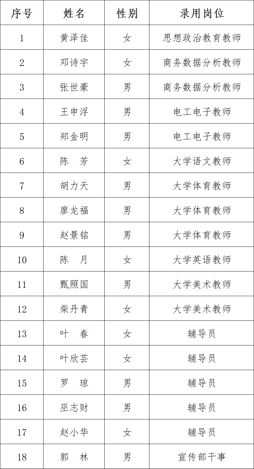 根据《彩神xl2022年第四次招聘公告》安排,经网上报名、资格初审、笔试🫱🏽、面试、试讲等招聘程序🍴,按照笔试、面试、试讲等综合考核排名🧏‍♂️🧎🏻‍♂️,拟聘用以下18名人员: