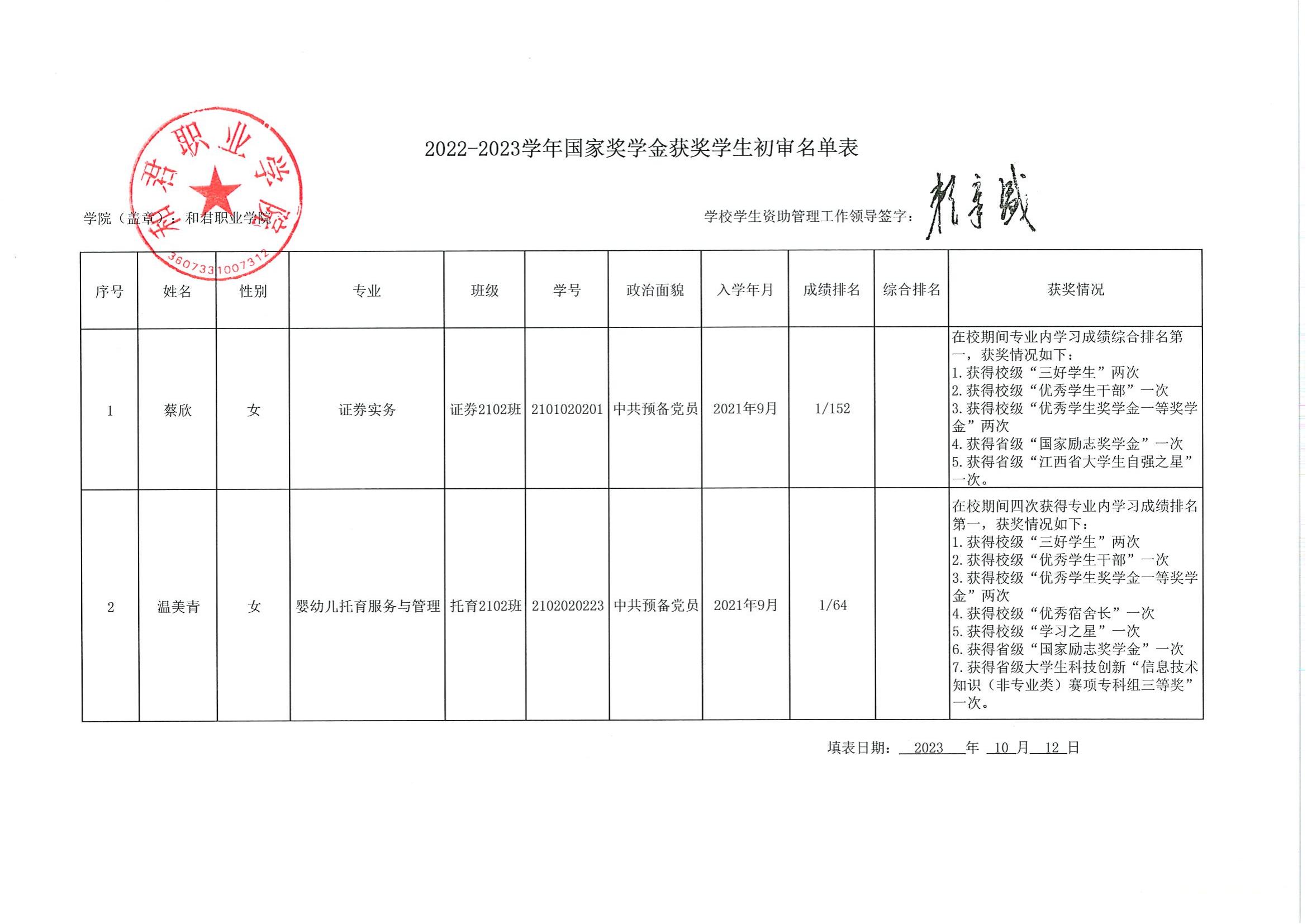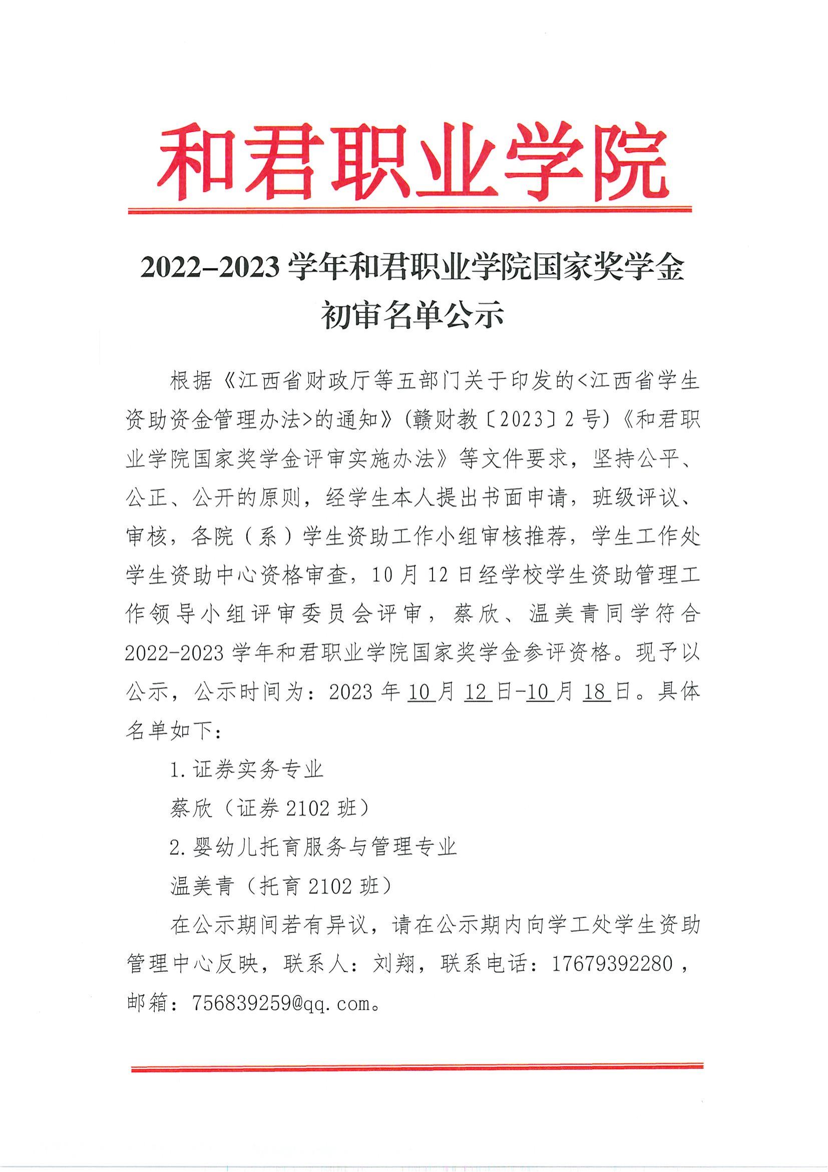 根据《江西省财政厅等五部门关于印发的<江西省学生资助资金管理办法>的通知》(赣财教[2023]2号)《彩神xl国家奖学金评审实施办法》等文件要求,坚持公平公正🙋🏼♀️🫸🏻、公开的原则🧑🏼🦰,经学生本人提出书面申请,班级评议👂🕵🏿、审核🕗,各院(系)学生资助工作小组审核推荐,学生工作处学生资助中心资格审查👴🏿😲,10月 12日经学校学生资助管理工作领导小组评审委员会评审,蔡欣、温美青同学符合 2022-2023 学年彩神xl国家奖学金参评资格。现予以公示,公示时间为:2023年10月12日-10月18日。如对公示内容有异议,可以向所在学院(学部)反映🤼♀️,也可直接向学校学工处学生资助中心反映,学校监督举报电话为: 0797-5669233,邮箱756839259@qq.com👩🏼🚀。