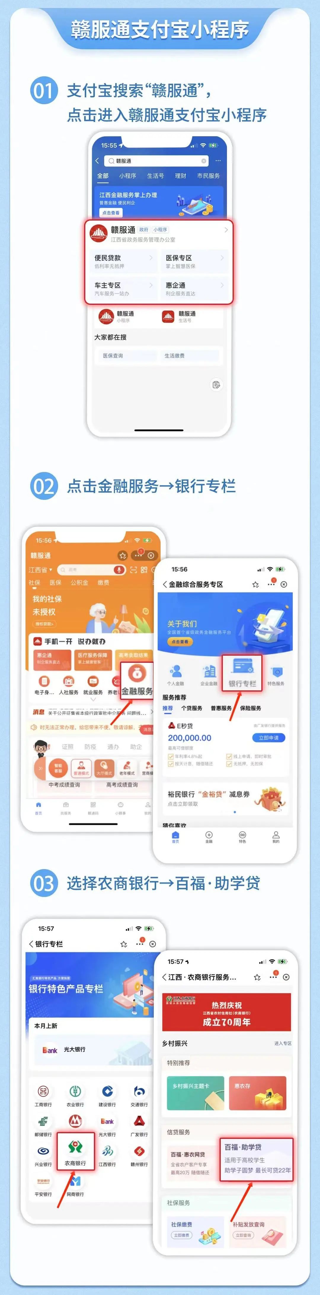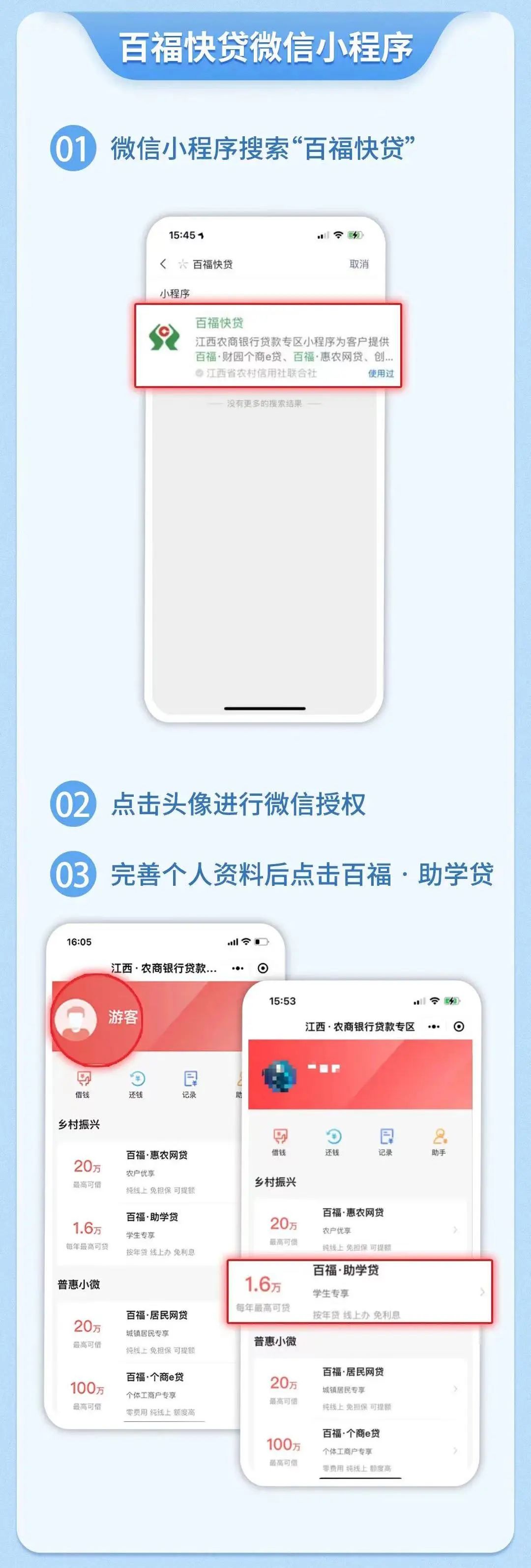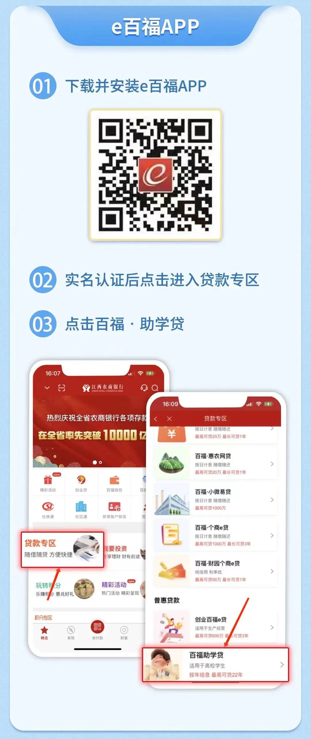 2.线上申请📖。登录江西·农商银行电子渠道客户端(指“e百福”APP🦸🏽♀️🈴、“百福快贷”微信小程序🧏♀️、“赣服通”支付宝小程序)🦹🏿♂️,进入“贷款专区”👨🏿🎤,点击“百福助学贷”👨🏼✈️,填写相关信息🤹🏻♂️,并提交申请👨👧👦。